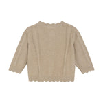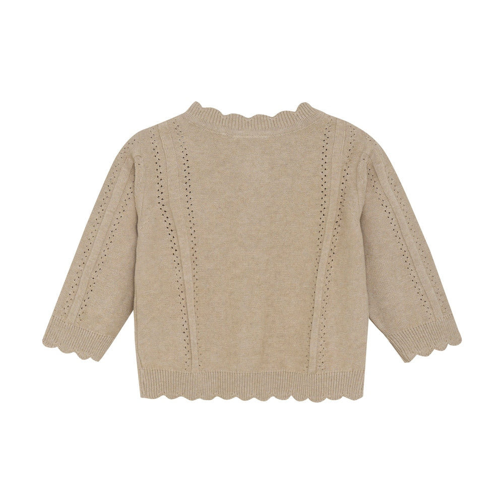 Schattig gebreide cardigan, gemaakt met een fijn ajourpatroon dat zorgt voor een luchtige en elegante look. De golvende randen bij de hals, mouwen en zoom geven het vestje een speels en lief detail. Op de voorkant zitten kleine, subtiele geborduurde bloemetjes en het sluit met knoopjes. Dit vestje is GOTS-gecertificeerd, wat betekent dat het gemaakt is van biologische materialen en op een duurzame, milieuvriendelijke manier geproduceerd wordt.