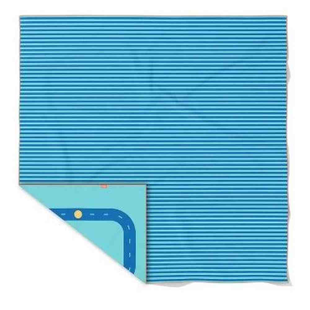 Aan de voorkant van het strandlaken vind je een plattegrond met wegen waarop je kindje dolle avonturen kan beleven. Aan de achterkant zorgt een kleurrijk, gestreept patroon voor extra flair.