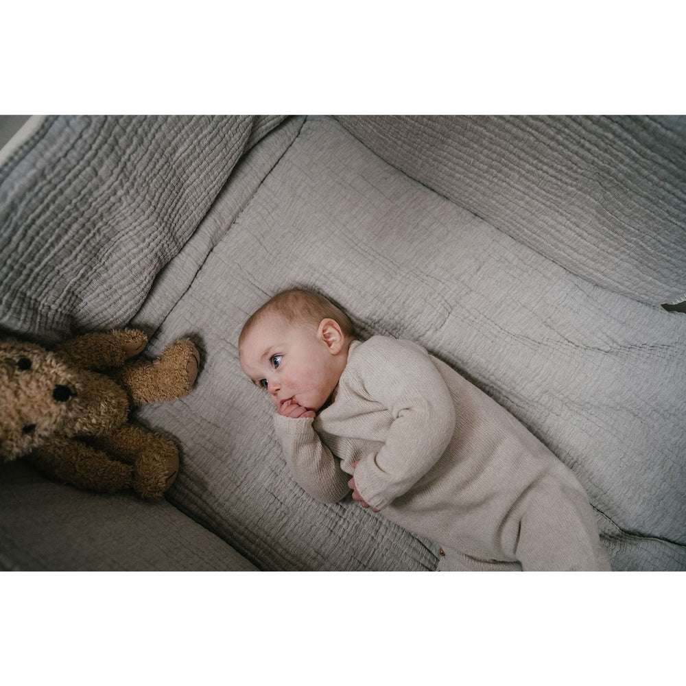 De Koeka Rivoli-lijn is gemaakt van luxueuze chenille stof, die niet alleen fluweelzacht aanvoelt maar ook duurzaam en slijtvast is. De kleur Stone – een koele grijstint – straalt rust en elegantie uit en past perfect binnen een moderne of natuurlijke babykamerstijl.