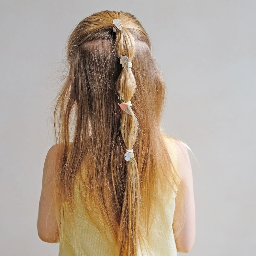 Deze schattige elastiekjes hebben elk een fantastisch klein wafelijsje met pastelbolletjes of prachtig glitterachtig ijs. Perfect om een vleugje zoetheid toe te voegen aan elke outfit!