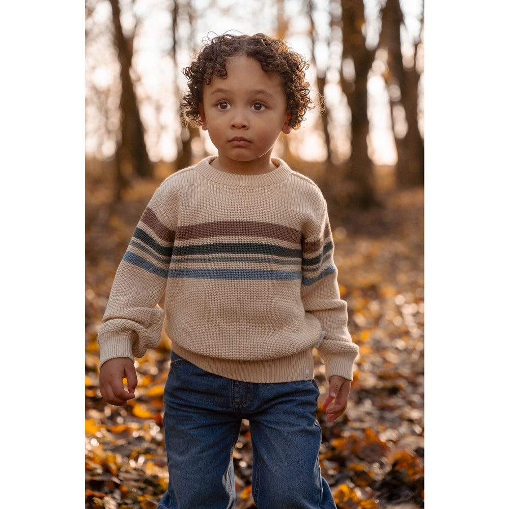 Get your little one ready for adventure with this cozy knitted sweater! In a stylish sand color with colorful stripes on the front and back, this sweater is the perfect complement to pants from our new collection. Whether you choose bold colors or calm tones, this sweater works with it all.
