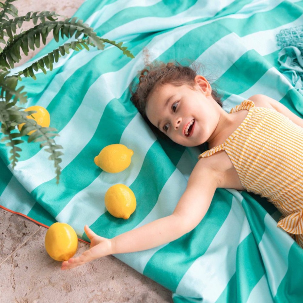 Heerlijk spelen op het strand, in de tuin of aan het zwembad. De handdoeken van Quut zijn badlaken en speelkleed in één!